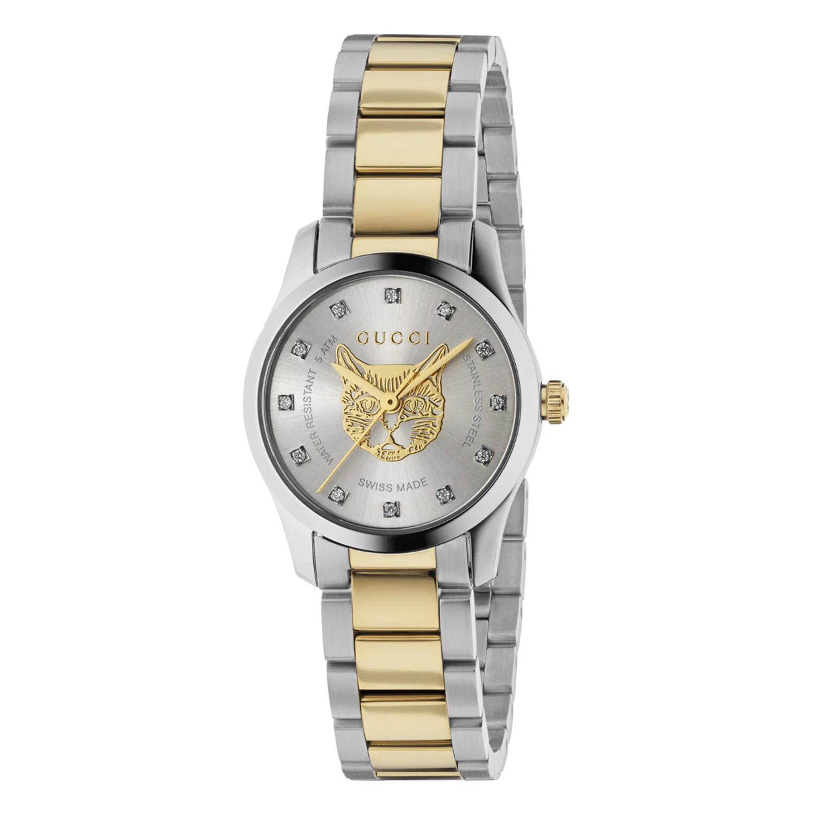 - Silver Dial with Gold Feline Head Motif